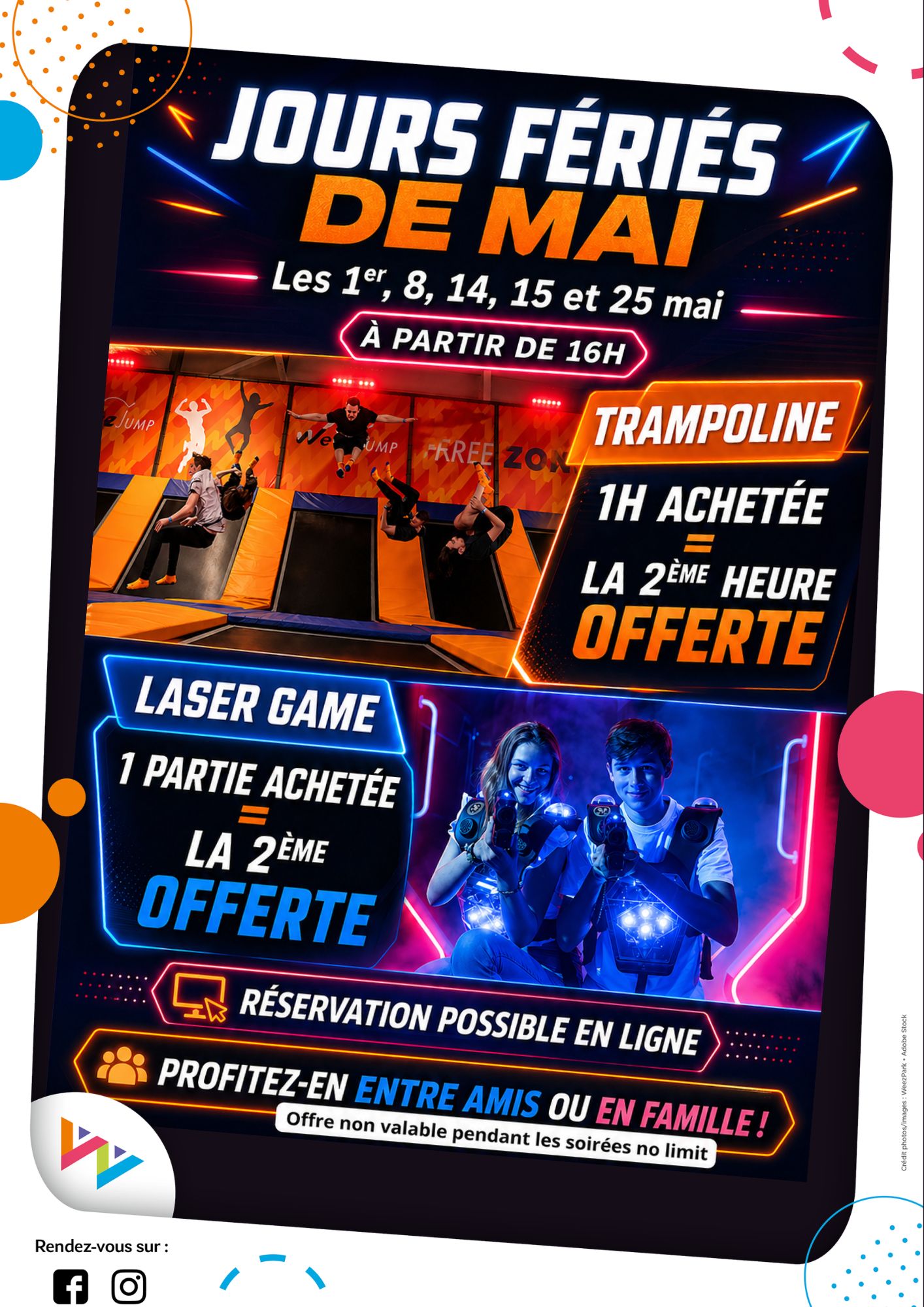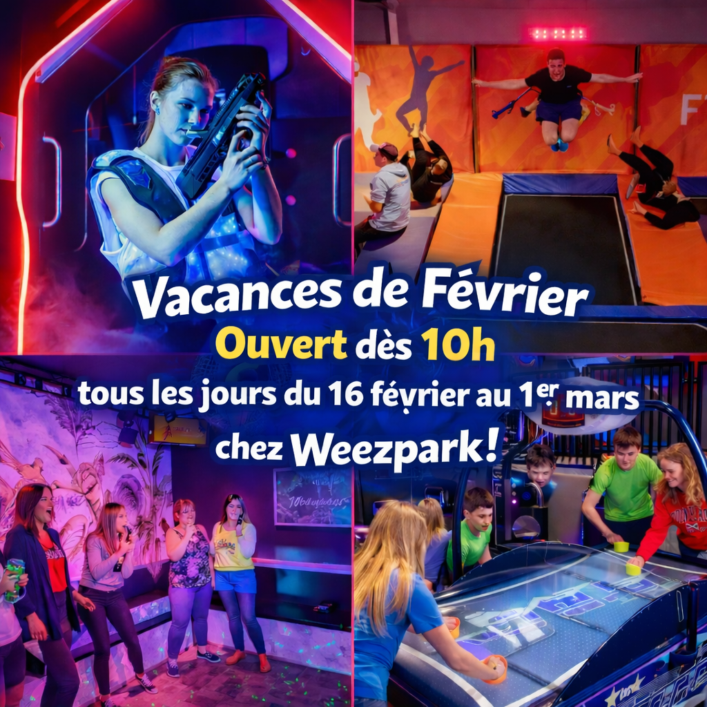 Nous vous attendons nombreux dans notre laser game, notre trampoline park, notre karaoké et notre espace jeux d’arcade chez Weezpark.